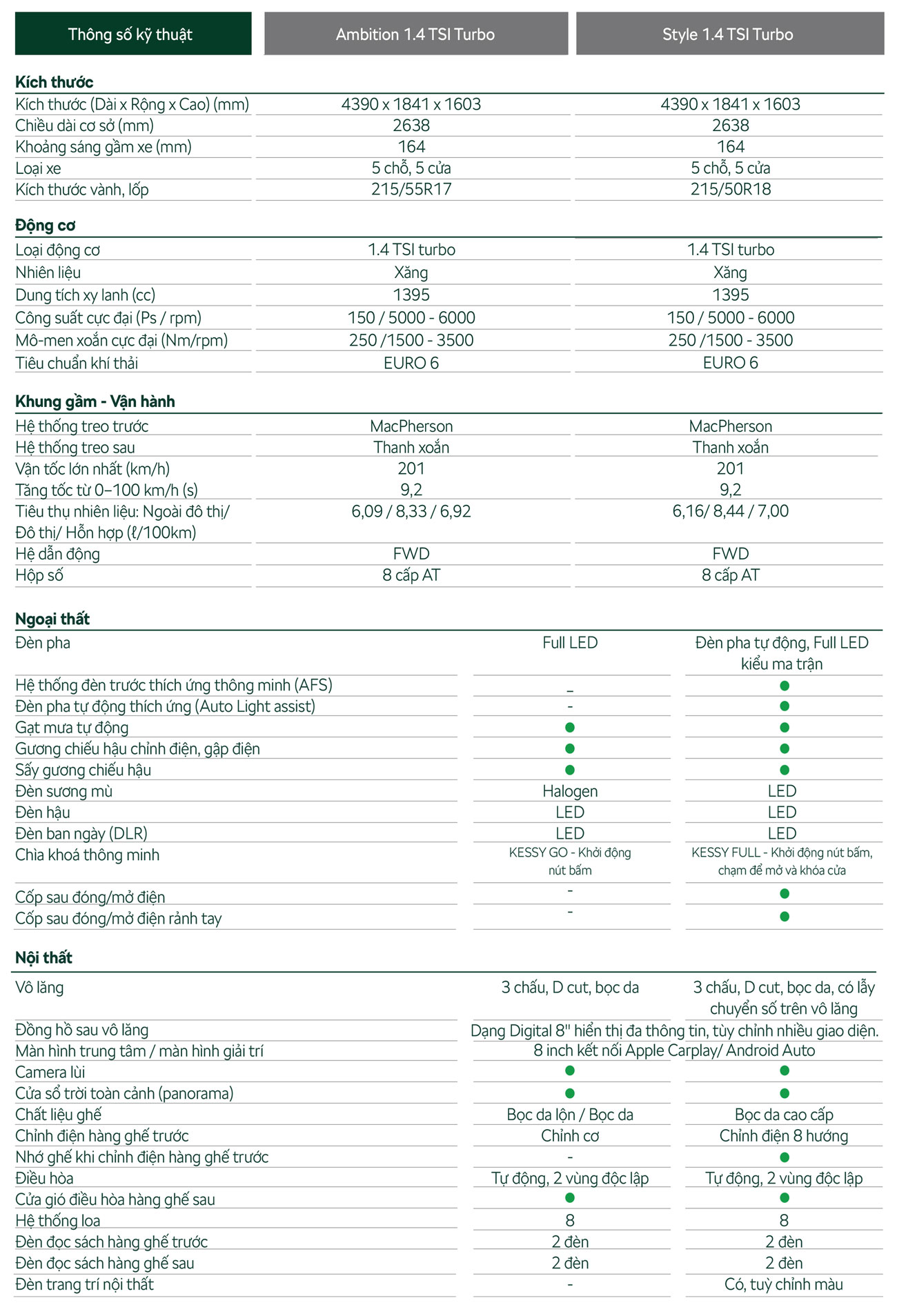 Động cơ xăng tăng áp Turbo TSI: Động cơ xăng tăng áp Turbo 1.4 TSI có công suất tối đa 150 Ps và mô men xoắn cực đại 250 Nm tại dải vòng tua thấp giúp đem lại cảm giác vận hành mạnh mẽ, bền bỉ nhưng cũng đặc biệt tiết kiệm nhiên liệu và bảo vệ môi trường khi đạt tiêu chuẩn khí thải EURO 6.
